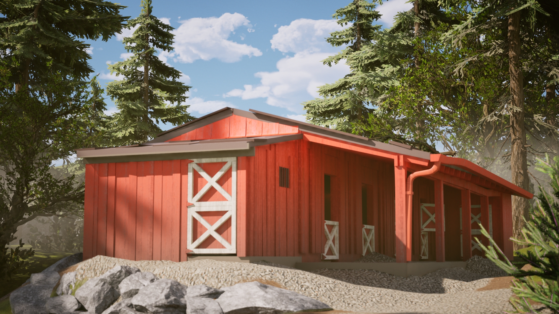 Here's my material setup for the barn structure. Of note is a fake ground AO effect to imitate dirt at the base of the structure, as well as a triplanar grunge and wetness parameter (used in the overcast image).